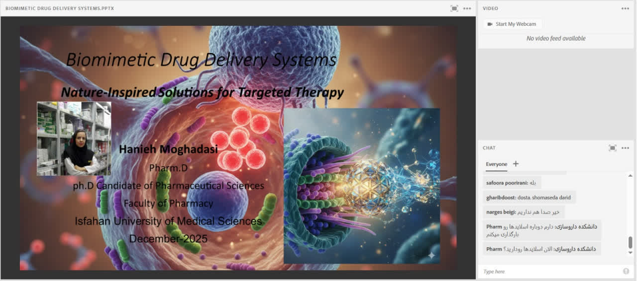 وبینار پژوهشی «سیستمهای دارورسانی مقلد زیستی (Biomimetic)» به همت مرکز تحقیقات سیستمهای نوین دارورسانی در تاریخ 24 آذرماه 1404 از ساعت 11 الی 12 برگزار شد. در این جلسه سخنران محترم، سرکار خانم دکتر هانیه مقدسی، رزیدنت گروه فارماسیوتیکس، ضمن بیان اهمیت سیستمهای مقلد زیستی، به معرفی نانوذرات بر پایهی گلبولهای قرمز، پلاکتها، گلبولهای سفید و اگزوزومها، کاربرد آنها در درمان سرطان، بیماریهای التهابی، بیماریهای سیستم عصبی مرکزی و توسعه واکسنها پرداختند. در ادامه، به مزایای سیستمهای مقلد زیستی و چالشهای آنها اشاره شد و در پایان، چشم انداز و آیندهی این فناوری معرفی گردید.